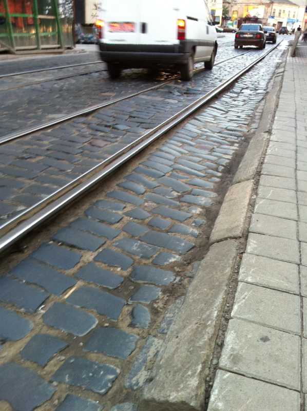 Note the size of the busesAs I entered L’viv, I and my bike got well shaken. I have never seen such bad cobble stone roads. That together with tracks made it very risky to drive. I’m glad it wasn’t wet. The picture says it all.